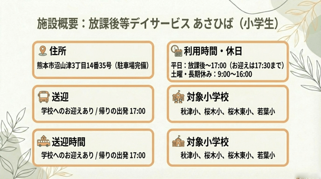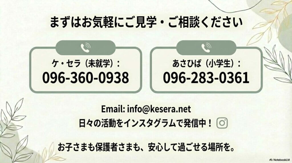 | (3)訪問支援ケ・セラ 開設日 2022年(令和4年)8月1日 所在地 〒861-2102 熊本市東区沼山津3-14-32 TEL(代表) 096-360-0938 E-mail:info@infokesera-net | |