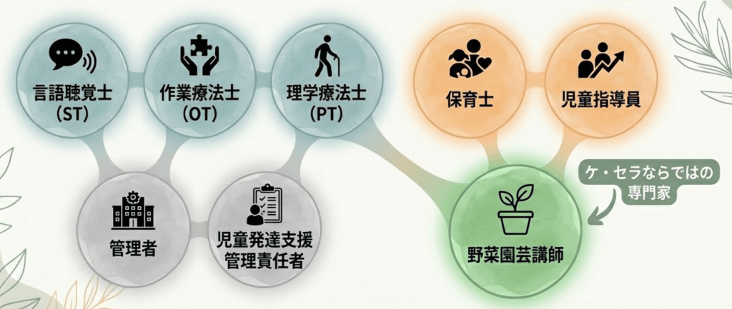 | 職員体制 ●管理者 ●児童発達支援管理責任者 ●保育士 ●児童指導員 ●言語聴覚士(ST) ●作業療法士(OT) ●理学療法士(PT) ●介護福祉士 |